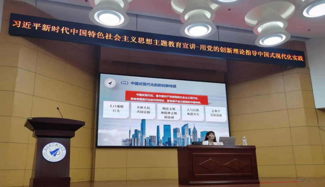 齐艳霞副教授以“用党的创新理论指导中国式现代化实践”为题,回顾了百年来中国共产党对中国式现代化的不懈探索,剖析了中国式现代化的创新特质,解读了中国式现代化的本质要求,从历史、理论和实践三个维度对中国式现代化的精髓要义作了深入的阐述。同时,根据党的十八大以来作出的东北振兴的一系列战略部署,结合《辽宁全面振兴新突破三年行动方案(2023—2025年)》《沈阳市全面振兴新突破三年行动方案(2023—2025年)》《yl6776永利集团深入落实辽宁全面振兴新突破三年行动实施方案》等,进一步分析了中国式现代化的辽宁实践、沈航实践。