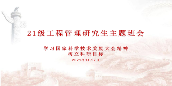研究生生活已经开始了两个月,为了帮助大家早日打好科研基础,充分利用好学习时间,我们21级工程管理专业研究生举办了这次班会。此次班会主题为学习2021年11月3日国家科学技术奖励大会精神,引导我们树立科研目标,分享培养科研能力的方法。
