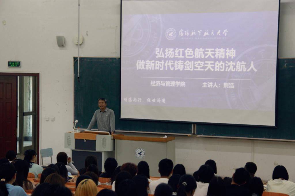 荆浩院长以航天传统精神、“两弹一星”精神、载人航天精神三大航天精神为引,带领同学们穿梭于浩瀚星空的追梦征程。当话题转向不久前奔赴太空执行任务的神舟二十号载人飞船航天员王杰学长,课堂氛围瞬间热烈起来。荆浩院长分享着王杰学长在沈航求学时的点点滴滴——他如何在实验室里日夜钻研,在训练场上挥汗如雨,以艰苦奋斗的意志打磨专业技能,用精益求精的态度雕琢航天梦想。王杰学长用实际行动诠释的航天精神,成为激励现场每一位学子的鲜活榜样。