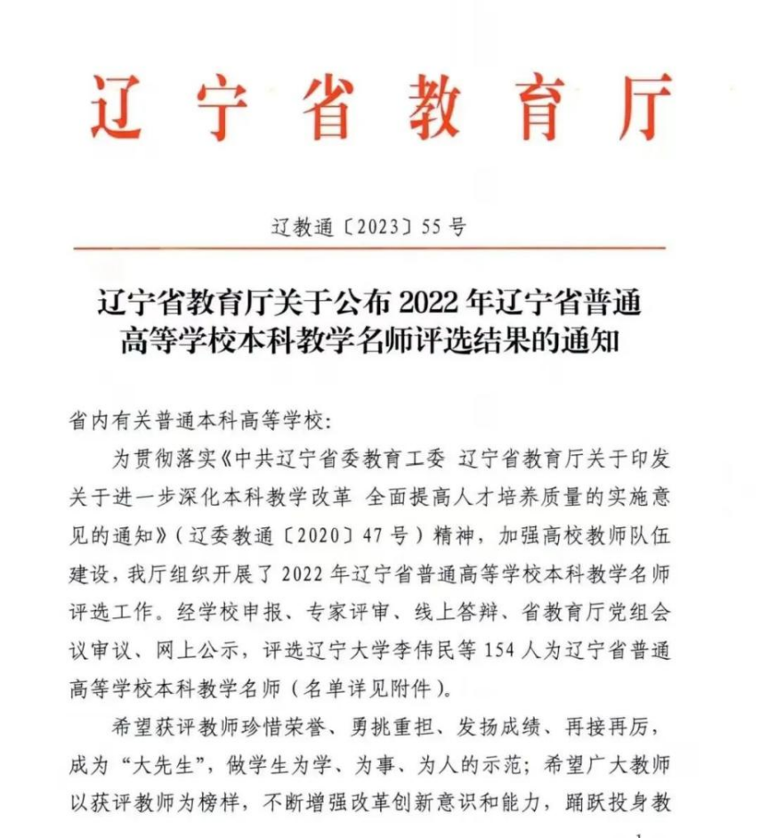 近日,辽宁省教育厅发布了《关于公布2022年辽宁省普通高等学校本科教学名师评选结果的通知》(辽教通〔2023〕55号),我院荆浩教授被评为2022年度辽宁省普通高等学校本科教学名师。