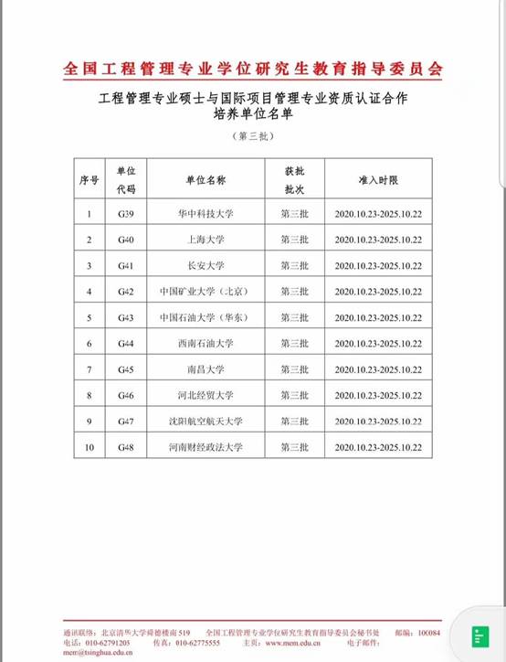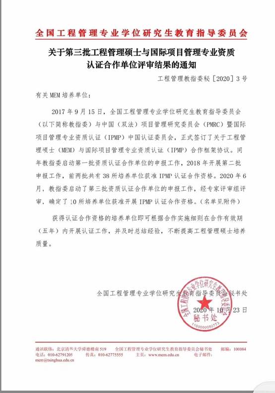 2020年10月23日,全国工程管理专业学位研究生教育指导委员会下发了“关于第三批工程管理硕士与国际项目管理专业资质认证合作单位评审结果的通知”,确定经专家评审组评审,我校yl6776永利集团的工程管理专业硕士(MEM)获准开展IPMP认证合作资格。依据合作实施细则,我校可在合作有效期(五年)内开展合作认证工作。