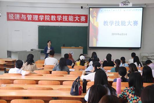 教学技能大赛由校教学质量与评估处高丹副处长,校教学名师、自动化学院卢艳军老师,经管学院党委书记吴景泰老师,校教学督导、经管学院赵庆国老师,省教学名师、经管学院金树颖老师担任评委。经管学院领导班子及教师现场观摩教学技能大赛。